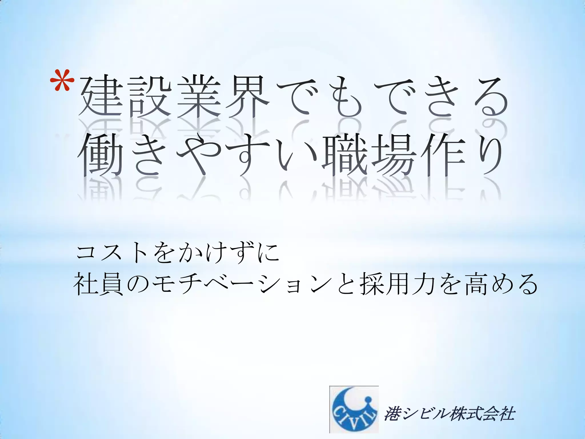 社員12名の建設会社が、社長の強いリーダーシップが職場を変革!取引先も巻き込みノー残業デーを実現。社員のやりがいをオーダーメイドで、積極的な人材育成に取り組み、社員定着率・技術力をアップ! Ustream:http://www.ustream.tv/recorded/20032350 twitterまとめ:http://togetter.com/li/249656