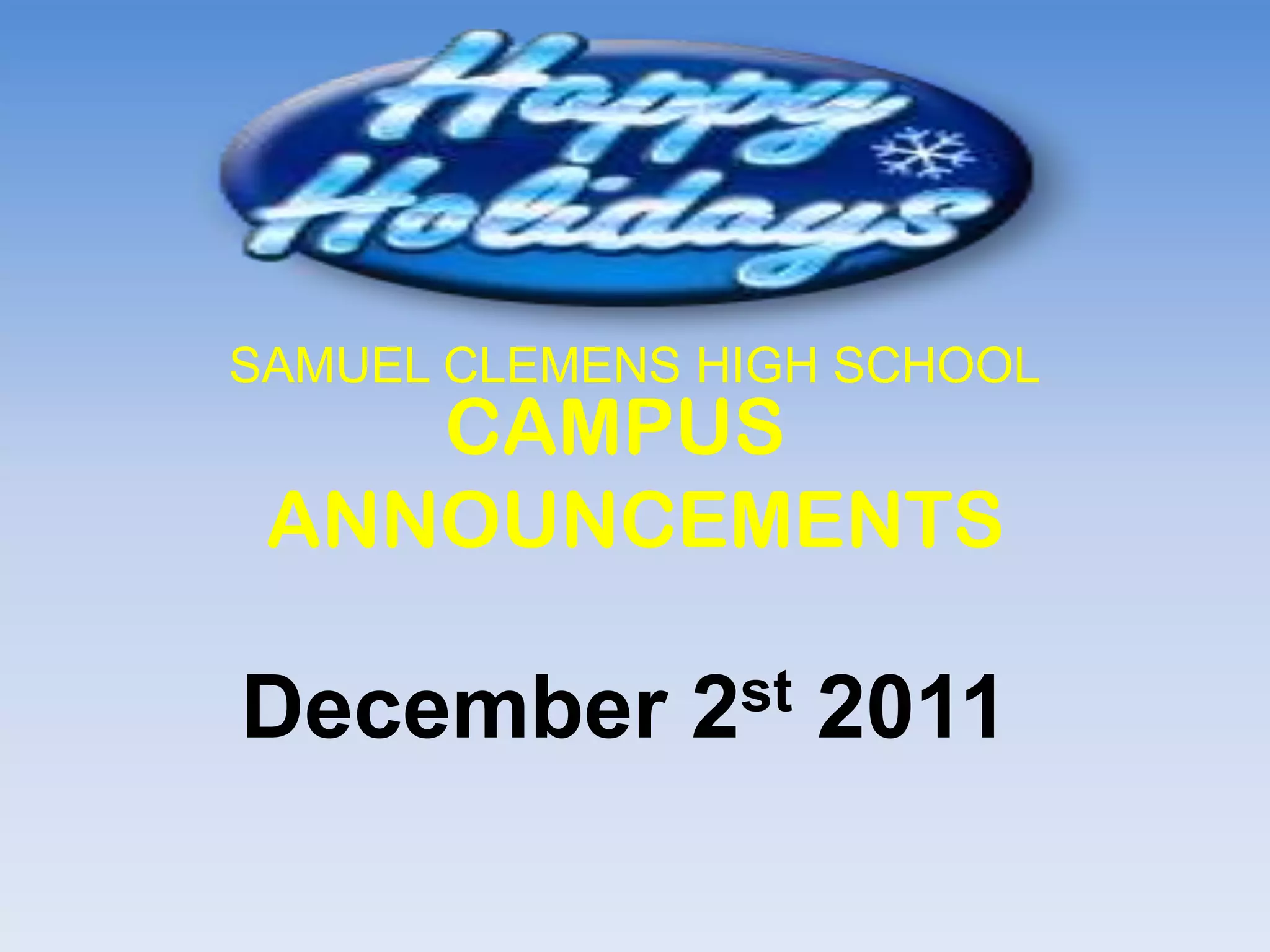 The Samuel Clemens High School campus announcements for December 2nd, 2011 include information about: paying library fines with canned goods for donations, an FFA meeting, a National Honor Society induction ceremony, the boys golf team winning a tournament, German calendars for sale, UIL spelling and vocabulary, an Angel Tree to help children, football players named to the all-district team, class rings being delivered, scholarships available, a cookie sale, an Optimist International essay contest, a lost and found, a holiday outfit contest for the yearbook, a dance team fundraiser, and bios and photos of contestants for a Mr. Clemens pageant.