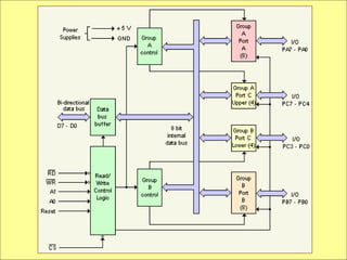 The document discusses the 8255 programmable parallel I/O device that can be used to interface I/O devices to a microprocessor like the 8085. It describes how the 8255 has three I/O ports (Port A, Port B, Port C) that can be configured using a control word. It then provides an example of interfacing an 8-bit analog to digital converter and temperature sensor to the 8255 ports to read temperature values using instructions like OUT, IN.