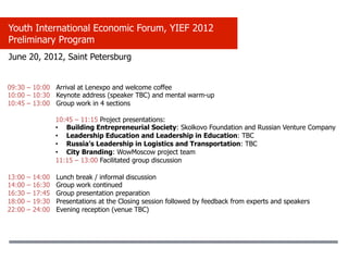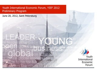 Молодёжный международный экономический форум (YIEF) 2012 пройдет в Санкт-Петербурге с 20 по 22 июня, включая ключевые мероприятия для молодых лидеров. Программа включает обсуждения, групповые работы и презентации на темы от предпринимательства до городской маркетинга. Участники смогут получить обратную связь от экспертов во время завершающей сессии и вечернего приема.