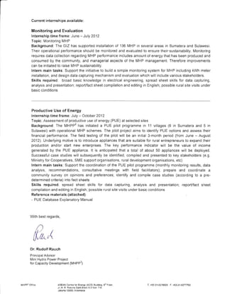 The GIZ Mini Hydro Power Project for Capacity Building (MHPp2) is offering internships in Jakarta, Indonesia for 2-6 months. MHPp2 aims to provide electricity to rural communities through micro-hydro power and other renewable energy technologies. Ensuring the sustainability of these projects is challenging and requires regular monitoring, evaluation, and community support. Internship opportunities are available in monitoring and evaluation or assessing productive uses of energy to support project implementation and sustainability. Interns will help monitor existing MHP performance, design monitoring systems, and identify opportunities for entrepreneurs to use energy and increase incomes. Strong analytical skills and experience in engineering, management, or socio-economic analysis is required.