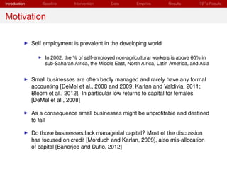 The document summarizes a study that evaluated the impact of a business literacy intervention in rural Mexico. The intervention provided free 6-week business skills courses taught by professors and students to about 25 women entrepreneurs per class. The courses covered topics like accounting, pricing, taxes, and marketing. The study found that the training led to large, positive and significant effects on profits, revenues, and number of clients both in the short- and medium-run. There was also evidence of heterogeneous treatment effects. The results suggest the training improved accounting practices, lowered costs, increased mark-ups, and in some cases lowered prices.