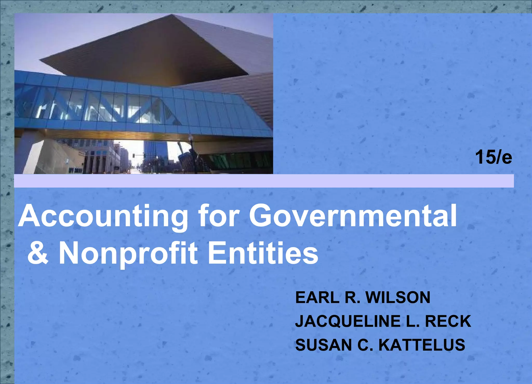 The document provides an overview of accounting and financial reporting for governmental and nonprofit entities. It discusses the key characteristics and objectives of financial reporting for these organizations, which differ from for-profit entities in their lack of profit motive and resource providers. The authoritative bodies that set standards for governmental and nonprofit accounting are also identified. An overview of the key elements of a comprehensive annual financial report for a state or local government is given, including the government-wide statements, fund statements, and statistical section.