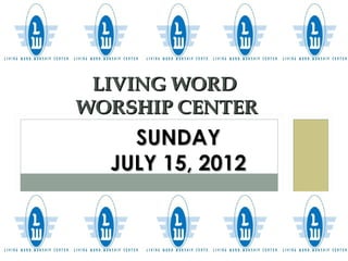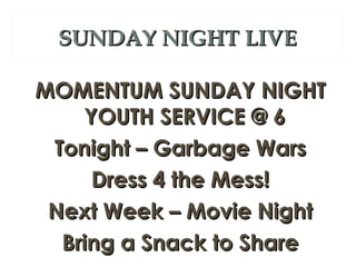 The document announces the schedule of events for the Living Word Worship Center for the coming week. Tonight is the youth service at 6pm called "Garbage Wars" where participants should dress for a messy event. Next Sunday is movie night where attendees should bring a snack to share. This Wednesday includes adult Bible study, youth group, and kids ministry plus nursery. Youth and kids camp is in 2 weeks from July 26-29 and participants should bring money and forms. There is also an announcement about an upcoming hog roast fundraiser and adult night out at the Grizzlies baseball game on August 14th.