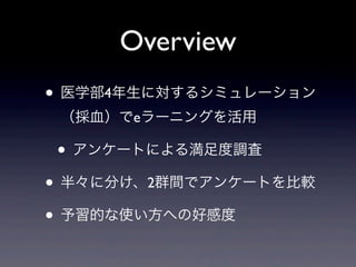 Overview • 医学部4年生に対するシミュレーション (採血)でeラーニングを活用 •