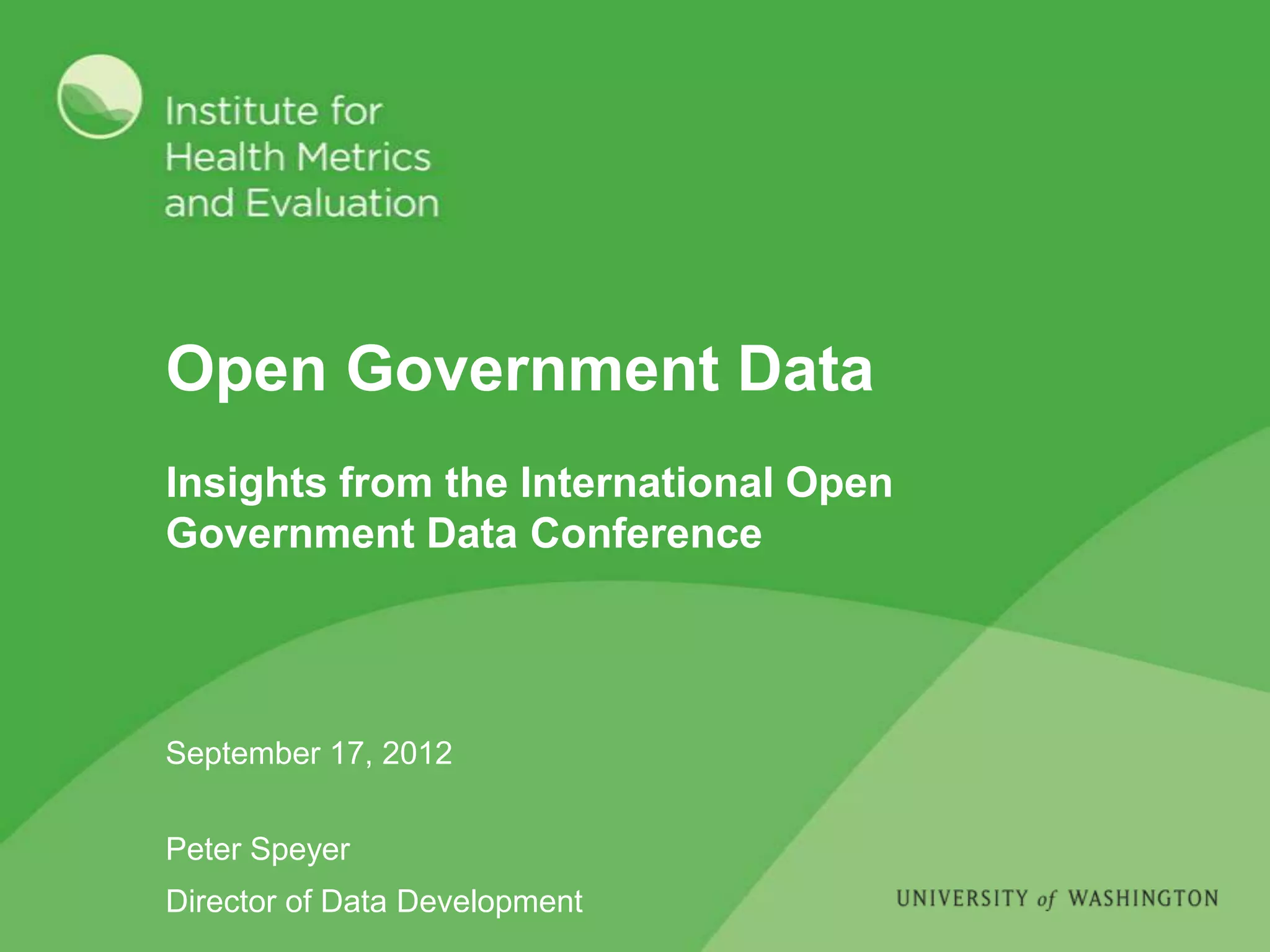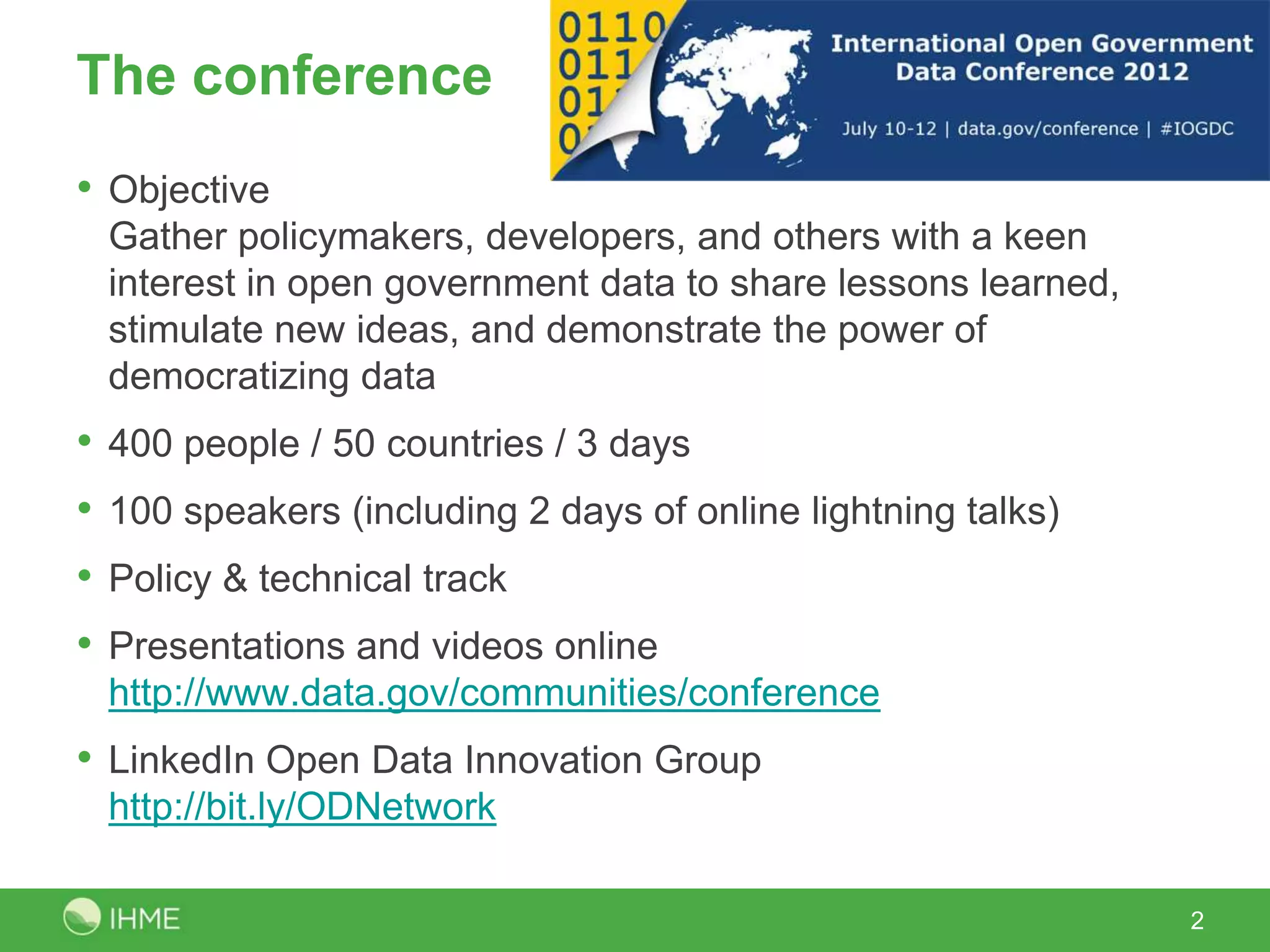 The International Open Government Data Conference in 2012 gathered 400 participants from 50 countries to discuss the potential and challenges of open government data. The event emphasized the importance of creating an ecosystem around data availability, focusing on improved public service, accountability, and economic opportunities. Key takeaways included the need for broader involvement of stakeholders and a shift from just publishing data to encouraging its innovative use.