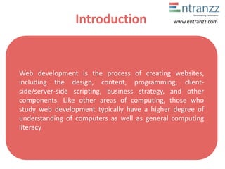 This document discusses careers in web development. It outlines that web development involves creating websites, including design, programming, and business strategies. Those with a 10+2 degree or higher can pursue this career. For most graduates, the direct path is becoming a web developer which involves developing, designing, and maintaining websites and applications to optimize user experience. Entry-level salaries for web developers in India range from Rs. 1,20,000 to Rs. 1,80,000 annually, increasing with experience up to Rs. 6,00,000 for senior positions. Several institutes in India offer programs related to web development.