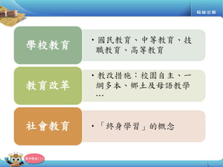 本章探討臺灣教育的發展,包括九年國民義務教育的推行及其成效,旨在提高國民的知識與素養,解決升學壓力,並促進經濟發展。教育改革的背景源於社會變遷與批判聲浪,政策包括校園自主、多元入學及教育本土化,雖然在某些方面取得成效,但仍面臨許多挑戰與問題。社會教育的發展意在提供成人教育,並藉助多樣的社會資源來達成這些目標。