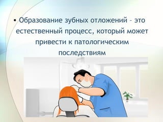 Документ описывает процессы образования зубных отложений, их классификацию и связанные с ними последствия. Основное внимание уделяется различиям между неминерализованными и минерализованными отложениями, а также методам их оценки с помощью индексов гигиены. Также рассматриваются факторы, способствующие образованию налета и камня на зубах.