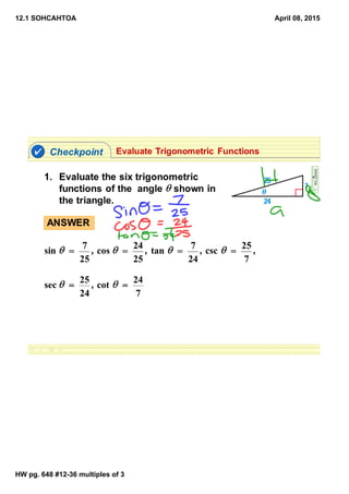 This document contains notes from a math class where students were working on homework problems involving trigonometry (SOHCAHTOA) and multiples of 3. The notes are dated April 08, 2015 and reference homework page 648 problems 12 through 36 dealing with multiples of 3.