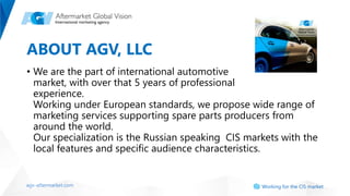 AGV, LLC является игроком на международном автомобильном рынке с более чем 5-летним опытом работы и предлагает широкий спектр маркетинговых услуг для производителей запчастей. Компания специализируется на русскоязычных рынках СНГ, предоставляя уникальные решения с учетом локальных особенностей. В документе также обсуждаются принципы B2B-переговоров, такие как причастность, визуализация и энергия.