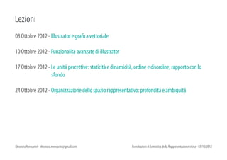 Il documento riguarda le esercitazioni di semiotica della rappresentazione visiva tenute da Eleonora Mencarini nel 2012/2013, con lezioni su software di grafica come Illustrator, principi di scienza della visione e organizzazione dello spazio rappresentativo. Ogni studente è tenuto a preparare un portfolio originale per la valutazione finale. Sono elencati anche strumenti e funzionalità del software necessari per completare gli esercizi.