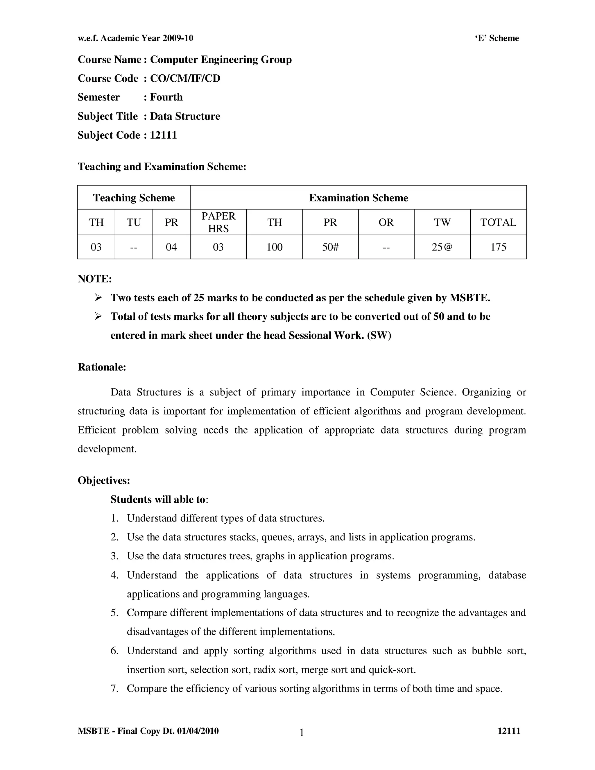 This document outlines the teaching and examination scheme for the fourth semester subject "Data Structure" in the Computer Engineering group. It includes the course code, teaching hours, examination structure, rationale, objectives, contents, practical skills and learning resources. The subject aims to teach different data structures, algorithms, their applications and comparisons. Students will learn concepts like arrays, stacks, queues, linked lists, trees and graphs through both theory and practical sessions. Assessment includes a theory exam worth 100 marks, practical exam worth 50 marks and term work worth 25 marks.