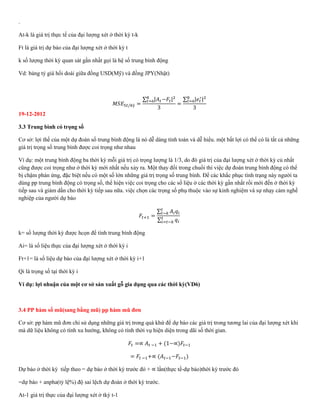 Tài liệu trình bày các phương pháp dự báo trong phân tích số liệu, bao gồm trung bình động đơn giản, trung bình động có trọng số, hàm mũ đơn, hàm mũ Holt và Holt-Winter. Mỗi phương pháp có ưu nhược điểm riêng và phù hợp với từng loại dữ liệu khác nhau, như dữ liệu không có xu hướng hay dữ liệu có tính xu hướng và tính thời vụ. Ngoài ra, tài liệu cũng đề cập đến phương pháp hồi quy tuyến tính đơn và hồi quy bội để phân tích mối quan hệ giữa các biến.