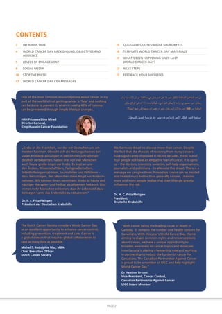 This document provides guidance and materials for marking World Cancer Day on February 4, 2013, which focuses on dispelling myths and misconceptions about cancer. It includes background on World Cancer Day, levels of engagement, social media guidance, key messages, quotations, and next steps. The goal is to raise awareness of actual cancer facts and increase events and participation from the previous year's World Cancer Day activities.
