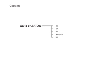 안티 패션은 현대패션에서 충격 뿐만 아니라 새로운 디자인을 창조하기 위한 자극과 영감을 제공하며 물질문명과 획일화된 현대사회를