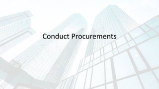 Conduct Procurements is the process of obtaining seller responses, selecting a seller, and awarding a contract. It involves evaluating seller proposals, negotiating with sellers, and selecting qualified sellers to establish legal agreements and contracts. Key inputs include the project management plan, project documents, procurement documentation, seller proposals, and organizational policies. Tools and techniques used include expert judgment, advertising, bidder conferences, data analysis, and negotiation. The main outputs are selected sellers and formal agreements and contracts.