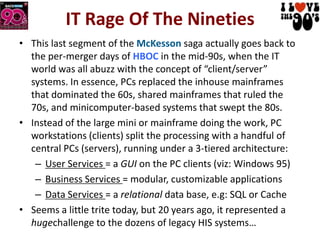 McKesson's Paragon electronic health record system originated in the 1990s as an executive information system called Paragon. It was re-written in the 1990s as a client-server system to replace aging legacy systems. Early implementations struggled but subsequent releases stabilized. By the 2000s, Paragon was successfully implemented at many hospitals due to its modern Microsoft-based architecture. In a surprising decision, a merged hospital network selected Meditech over Paragon to provide system consistency for users during a challenging transition period, demonstrating a focus on the overall needs of the organization. Paragon went on to become very successful for McKesson due to its flexible, standards-based design.