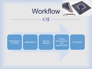 RFID technology has many promising applications. Overall, respondents were positive about RFID's potential. Most saw opportunities in inventory control, logistics/supply chain management and library management. Some concerns remain around cost and standardization, but further development is expected in medical uses and other industries. With refinements, RFID may provide significant benefits for tracking, access control and customer services.