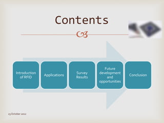The document discusses RFID technology including its components, types of tags, applications, and survey results. RFID systems consist of tags, readers, and software. Tags can be passive, semi-passive, or active. Common applications include asset tracking, supply chain management, electronic toll collection, and smart cards. A survey found potential uses in inventory control, logistics, libraries, and security. Further development of RFID is seen in medical and library applications.