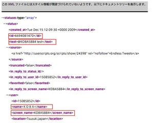 取得時のおまじない $replyurl = " http://twitter.com/statuses/mentions.xml?count=1 " ; $result = file_get_contents($replyurl , false, stream_context_create(array( "http" => array( "method" => " GET ", "header" => "Authorization: Basic ". base64_encode($username. ":". $password) ) ))); - 36.