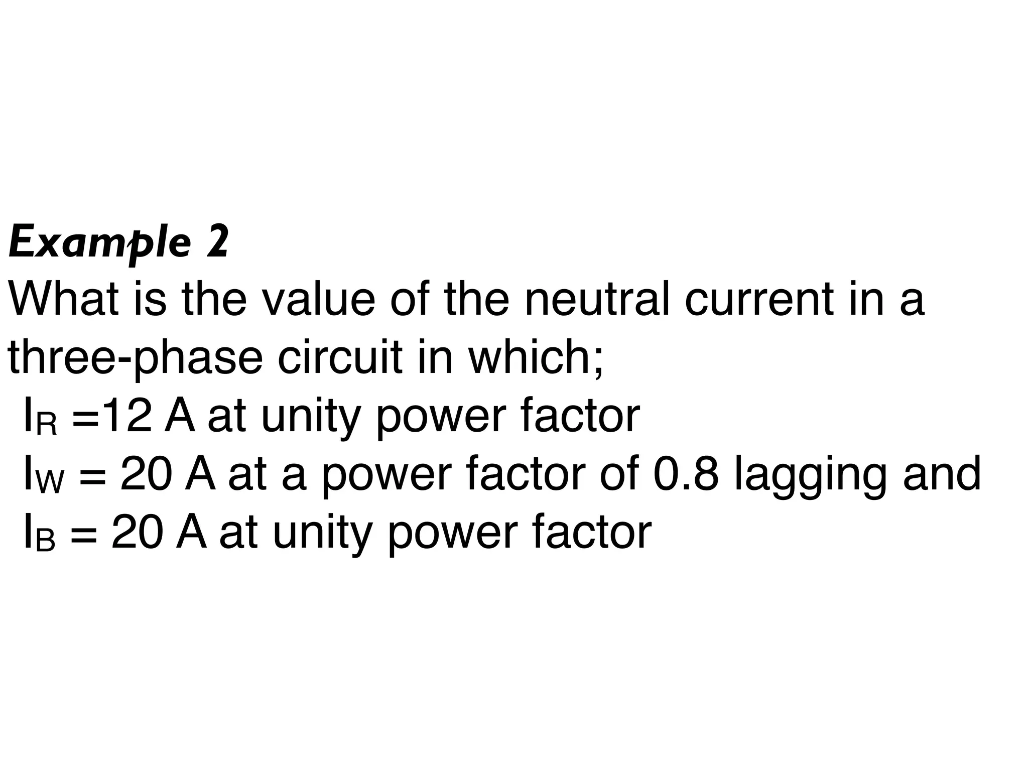 The neutral current in a three-phase circuit with phase currents of 12A at unity power factor, 20A at 0.8 lagging power factor, and 20A at unity power factor can be calculated. A power factor of 0.8 corresponds to a 37 degree lag between the current and voltage.
