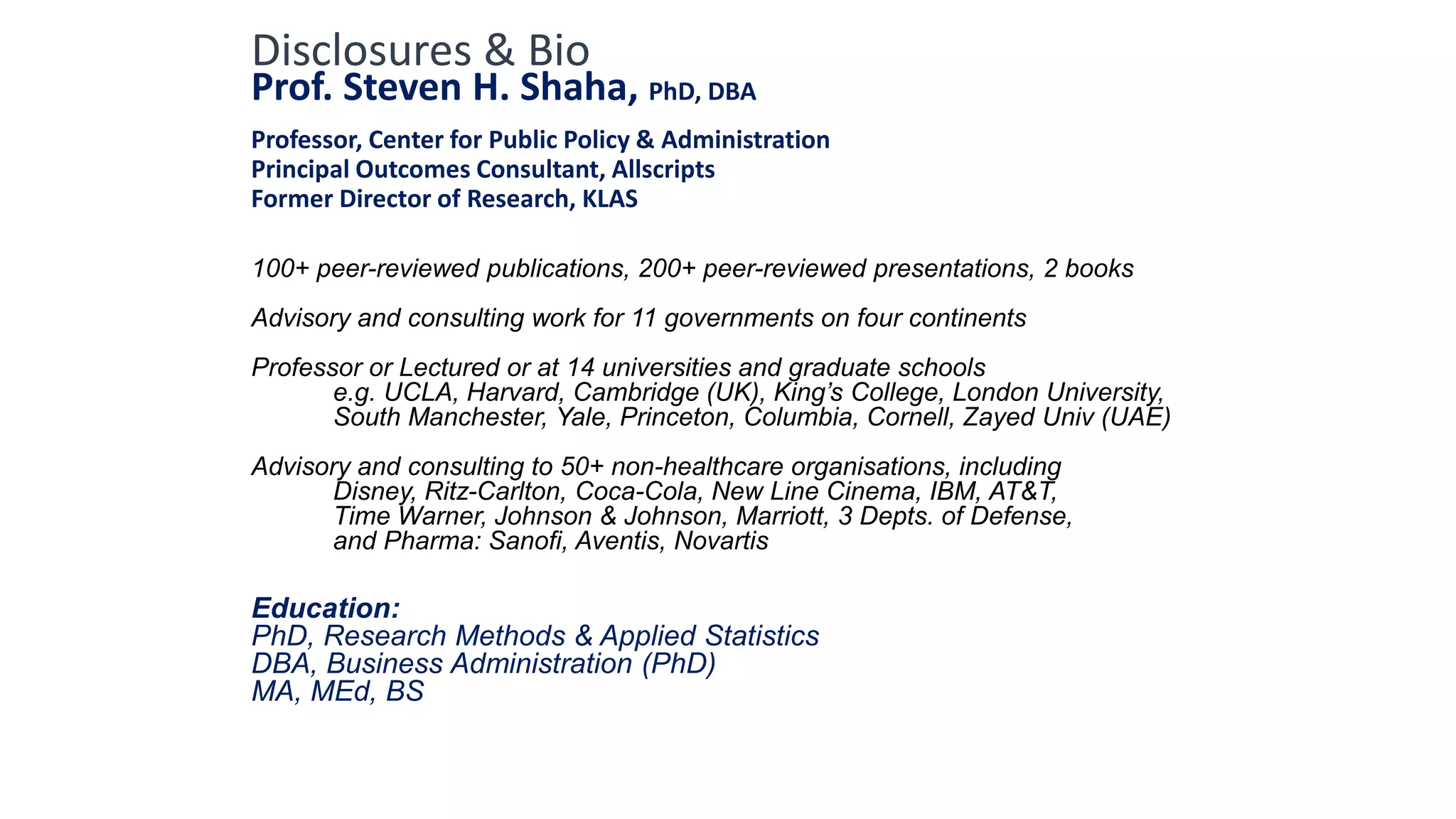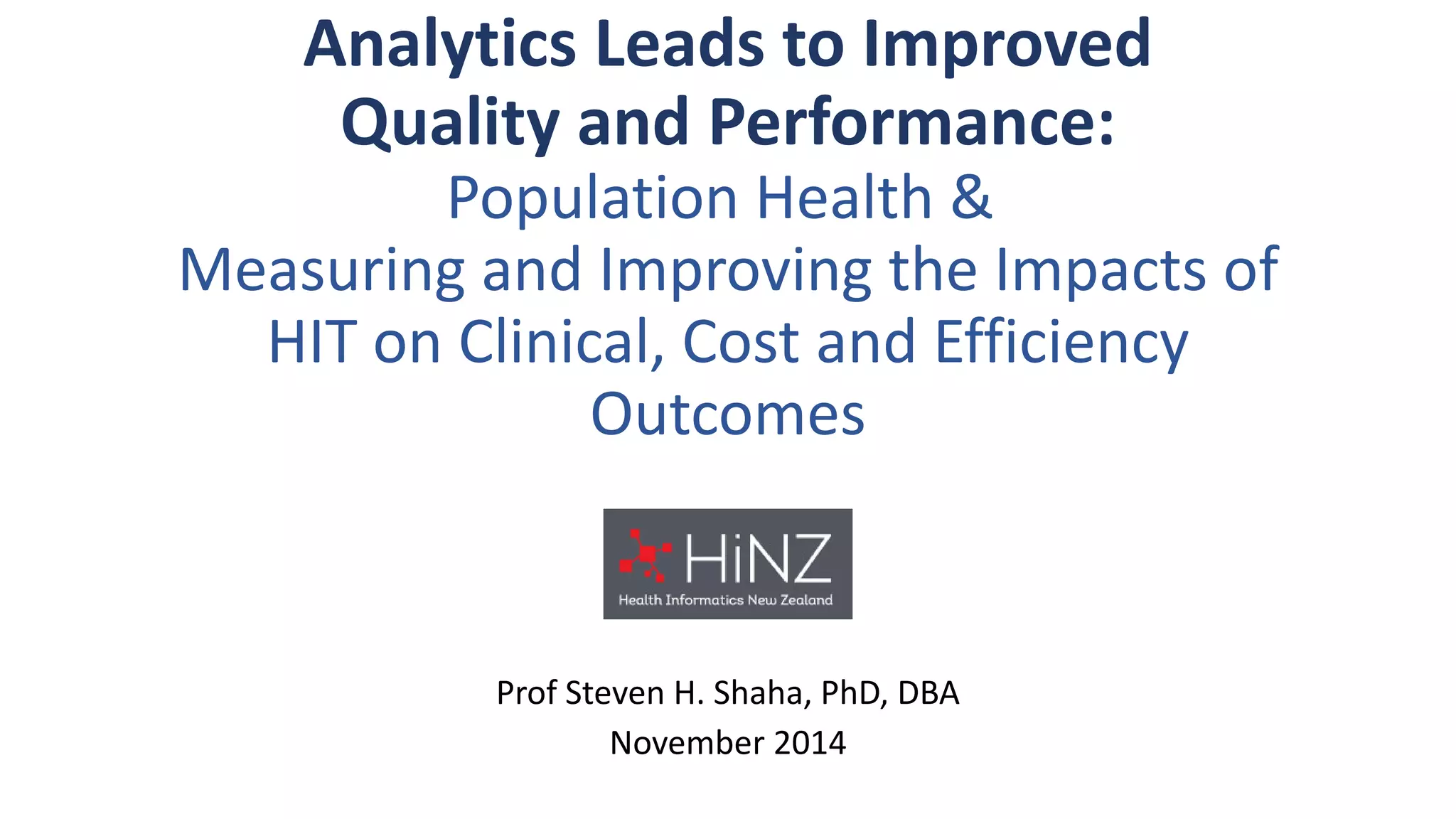 This document summarizes the background and work of Prof. Steven H. Shaha, who has published over 100 peer-reviewed publications and presentations on using analytics and clinical decision support systems to improve healthcare quality and outcomes. Some key points discussed include using analytics of electronic medical record data to reduce sepsis rates and length of ICU stays, developing alert systems to more quickly recognize and treat at-risk patients, and creating connected networks between healthcare providers to better monitor population health and improve outcomes for conditions like diabetes.