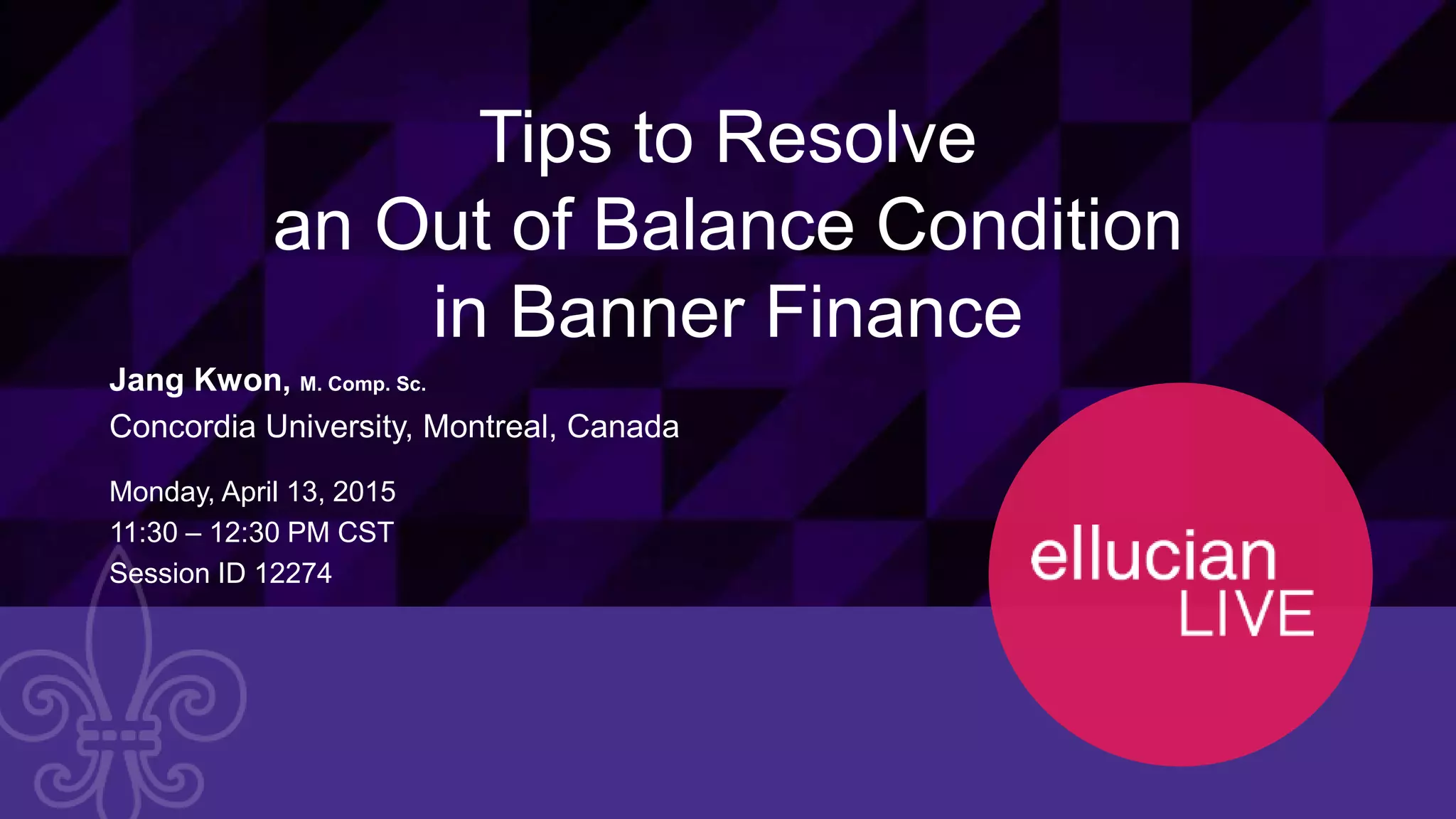The document outlines a presentation on resolving out of balance conditions in the accounts payable module in Banner Finance. It discusses the different types of out of balance conditions, how to identify them using the FGRCTRL report, and the architecture of how invoices and payments flow through accounts payable in Banner. Potential causes of out of balances are explored, such as changes to invoice flags, posting disruptions, check cancellations, and unexpected changes to the system. Examples will be provided to demonstrate resolution techniques.