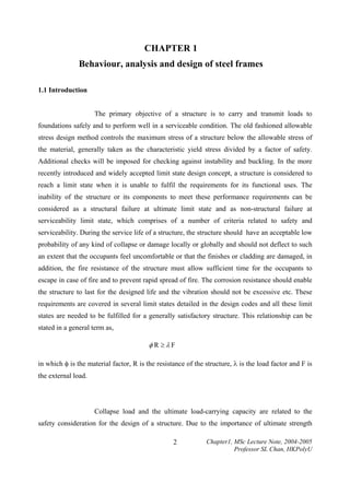 This document provides a summary of Chapter 1 from an MSc lecture note on the stability of structures. It discusses the behavior, analysis, and design of steel frames. It covers key topics like limit state design concepts, load factors, types of loads (dead, live, wind, earthquake), and linear analysis methods commonly used in structural engineering practice and design codes. The chapter introduces fundamental concepts important for understanding the analysis and design of structures for safety and serviceability.