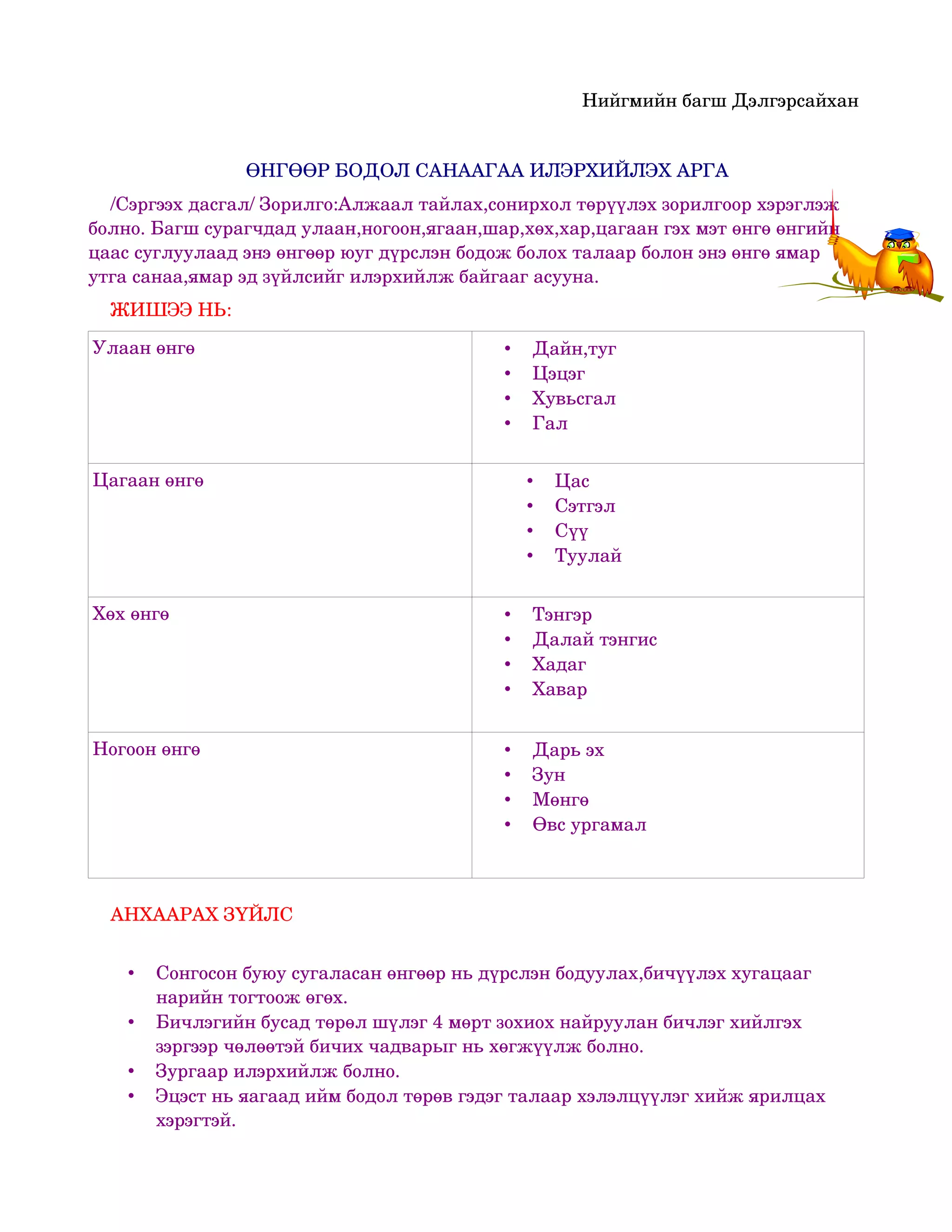 ӨНГӨӨР БОДОЛ САНААГАА ИЛЭРХИЙЛЭХ АРГА /Сэргээх дасгал/ Зорилго:Алжаал тайлах,сонирхол төрүүлэх зорилгоор хэрэглэж болно. Багш сурагчдад улаан,ногоон,ягаан,шар,хөх,хар,цагаан гэх мэт өнгө өнгийн цаас суглуулаад энэ өнгөөр юуг дүрслэн бодож болох талаар болон энэ өнгө ямар утга санаа,ямар эд зүйлсийг илэрхийлж байгааг асууна. ЖИШЭЭ НЬ: Улаан өнгө • Дайн,туг • Цэцэг • Хувьсгал • Гал Цагаан өнгө • Цас • Сэтгэл • Сүү • Туулай Хөх өнгө • Тэнгэр • Далай тэнгис • Хадаг • Хавар Ногоон өнгө • Дарь эх • Зун • Мөнгө • Өвс ургамал АНХААРАХ ЗҮЙЛС • Сонгосон буюу сугаласан өнгөөр нь дүрслэн бодуулах,бичүүлэх хугацааг нарийн тогтоож өгөх. • Бичлэгийн бусад төрөл шүлэг 4 мөрт зохиох найруулан бичлэг хийлгэх зэргээр чөлөөтэй бичих чадварыг нь хөгжүүлж болно. • Зургаар илэрхийлж болно. • Эцэст нь яагаад ийм бодол төрөв гэдэг талаар хэлэлцүүлэг хийж ярилцах хэрэгтэй.