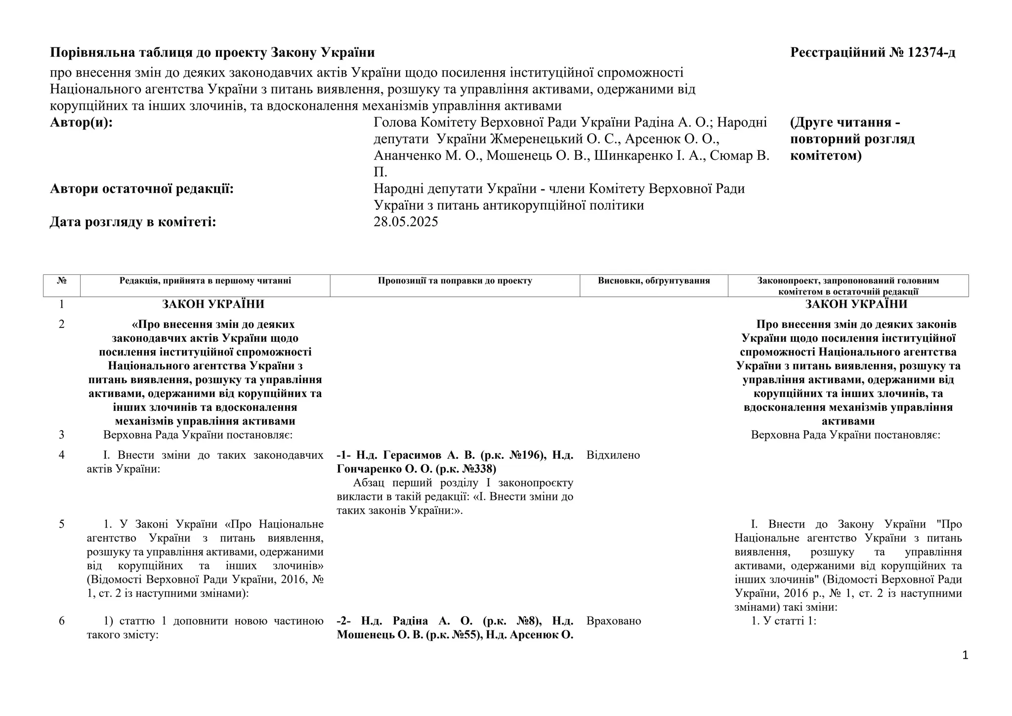 Порівняльна таблиця допроекту Закону України Реєстраційний № 12374-д