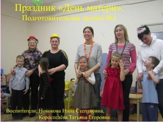 Документ описывает праздник «День матери», который пройдет 25 ноября 2016 года в подготовительной группе №3. Цель мероприятия - повысить социальную значимость материнства и формировать у детей любовь и заботу о матерях. В программе планируются конкурсы и танцы, направленные на развитие эмоциональной отзывчивости и привязанности к мамам.