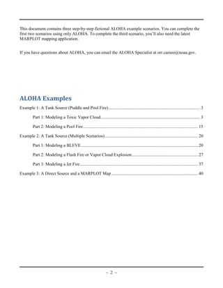 The document provides detailed step-by-step fictional scenarios utilizing the ALOHA software for modeling chemical releases, specifically focusing on a benzene leak in an industrial park. It outlines procedures for inputting data, assessing toxic vapor clouds, thermal radiation threats, and visualizing threat zones based on hypothetical incidents. The scenarios illustrate the importance of accurate modeling for emergency response planning and include sample calculations for evaluating vapor concentration and fire hazards.