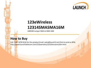 The document describes a 16m LMR240 jumper cable with SMA connectors on both ends sold by 123eWireless. It provides contact information for purchasing the item, as well as details on payment options, same-day shipping, warranty, and additional services offered by the seller like repairs, maintenance contracts, and equipment recycling.