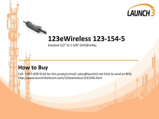 This document provides information about the 123eWireless 123-154-5 EasySeal 1/2" to 1-5/8" GSIC Enclosure, including how to purchase it, payment options, shipping details, warranty, and additional services offered by Launch 3 Telecom such as repairs. The 123-154-5 is a weatherproofing kit that seals enclosures from 1/2" to 1-5/8". Launch 3 Telecom is a telecom supplier that can be contacted by phone or email for purchases or questions.