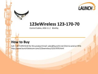 This document provides information about purchasing a 123eWireless 123-170-70 70-meter control cable. It describes payment and shipping options, same-day shipping availability, warranty and return policies, and additional services offered by Launch 3 Telecom such as repairs, maintenance contracts, de-installation, and equipment recycling. Launch 3 Telecom is a telecom equipment supplier and provider of installation and repair services.