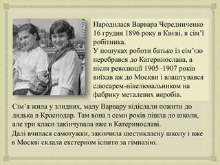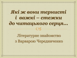 Ім’я Варвари Чередниченко сьогодні мало відоме читачам, хоча вона була однією з найцікавіших письменниць нашої літератури 20-х – 40-х років ХХ століття. Педагог, публіцист, перекладач з осетинської та грузинської мов, Варвара Чередниченко лишила по собі цікавий мистецький доробок: статті про майстрів слова, п’єси, казки, оповідання, роман «За плугом», кілька історико-біографічних оповідань і повістей, незакінчений історичний роман «Фастів» та, на жаль, теж незавершений роман «Молодість Григорія Сковороди».