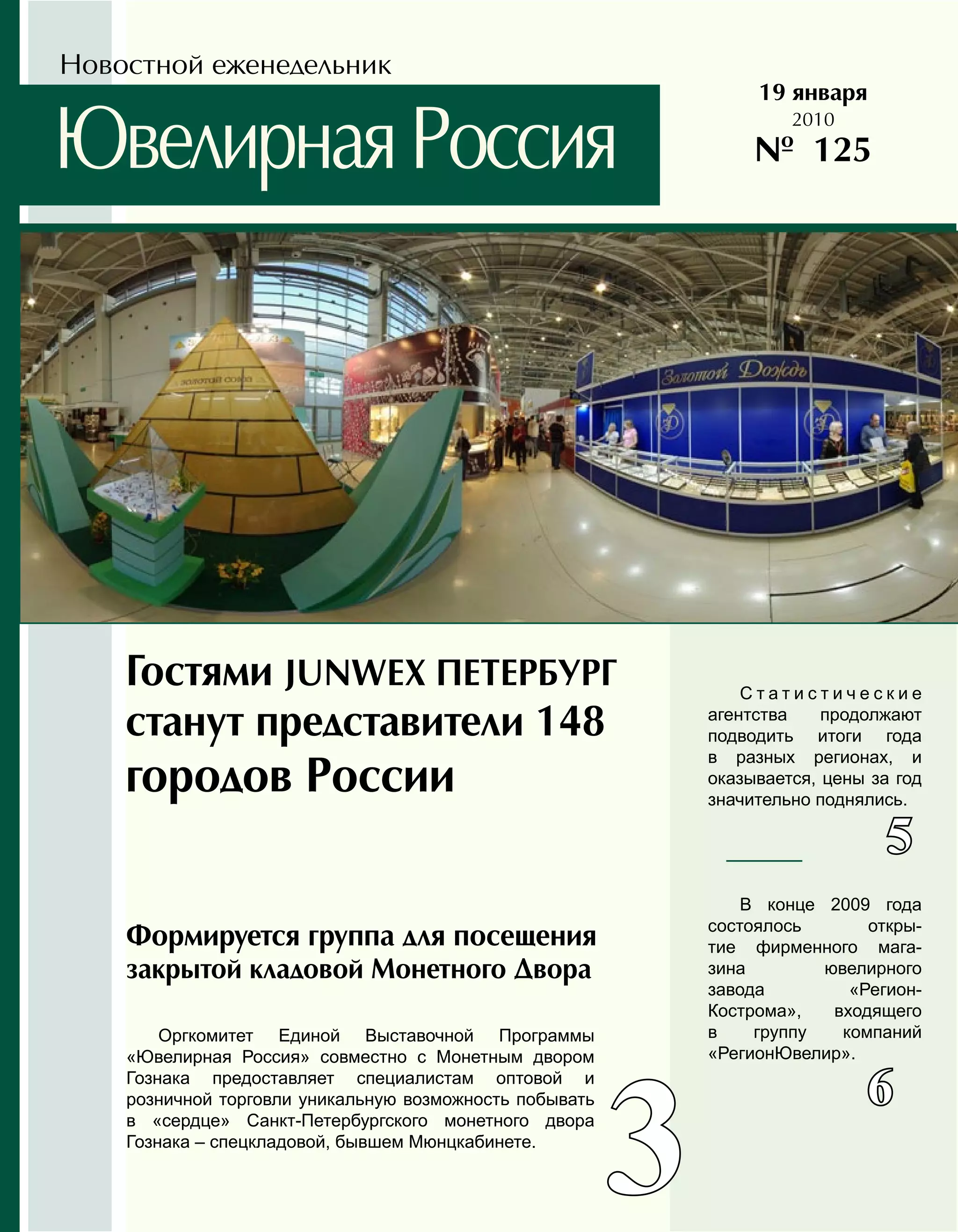 В еженедельнике 'Ювелирная Россия' от 19 января 2010 года обсуждаются рост цен на ювелирные изделия, которые увеличились на 25-36% в разных регионах России в 2009 году. В преддверии выставки 'Junwex Петербург' запланировано множество мероприятий, включая экскурсии на монетный двор и семинар по противодействию отмыванию доходов. Также представлены новые коллекции ювелиров, включая обновленный ассортимент от компании 'ника' и первую ювелирную коллекцию актера Константина Крюкова.