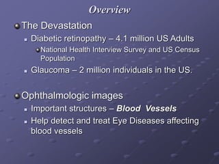 This document discusses automatic detection of blood vessels in digital retinal images using computer vision and image processing (CVIP) tools. It begins with an overview of eye diseases like diabetic retinopathy and glaucoma that can be detected by observing blood vessels in retinal images. It then describes 6 common approaches to blood vessel extraction, including pattern recognition, model-based, tracking-based, and neural network approaches. The document outlines the methods used in the study, including preprocessing retinal images, extracting blood vessels using tools like filters, and postprocessing the results. It provides examples of blood vessel extraction and suggests areas for future work, such as developing techniques to better detect minor blood vessels and separate blood vessels from other structures.