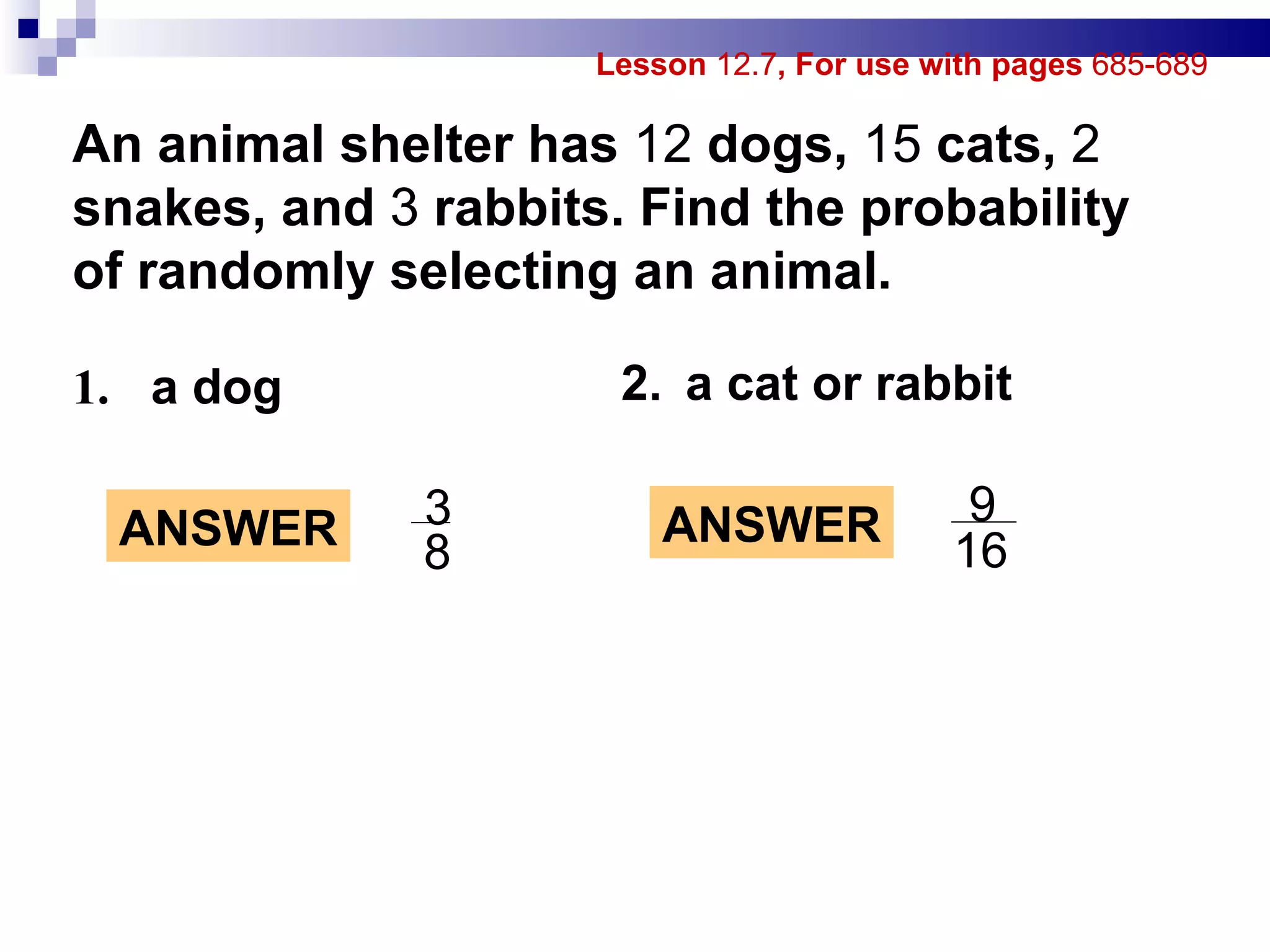 The document provides lesson material on probability and odds, including definitions, examples and practice problems. It defines key terms like probability, complementary events, odds, and discusses how to calculate probabilities and odds for various scenarios. Practice problems ask students to calculate probabilities and odds based on given information, such as the likelihood of random outcomes or events.
