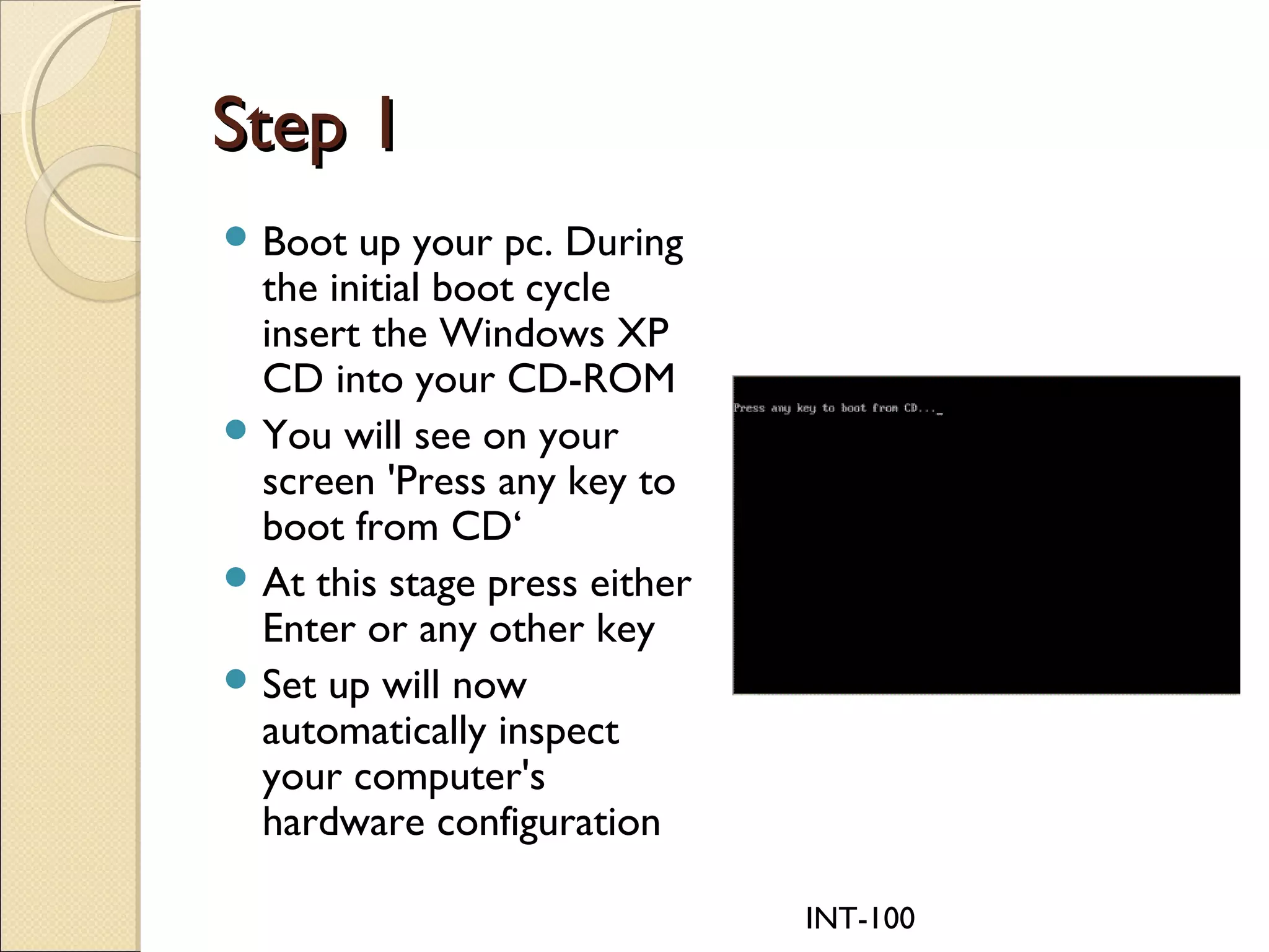 The document provides a 32 step process for installing Windows XP from start to finish. It begins by booting from the Windows XP CD and checking hardware compatibility. The user then formats their hard drive, copies Windows files, sets regional and user preferences, and activates Windows. The process concludes with the Windows desktop loading upon completion of installation.