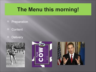This document provides tips for making effective presentations to investors, including preparing content, delivering the presentation, and structuring the presentation. It recommends addressing your industry status, value proposition, business model, validation of ideas, management credibility, and financial needs. Key details to memorize include cash flow needs, portfolio companies, investment criteria, and reasons the business exists. The presentation should highlight the company's uniqueness, business model, management team, and competitive advantages within the industry landscape.