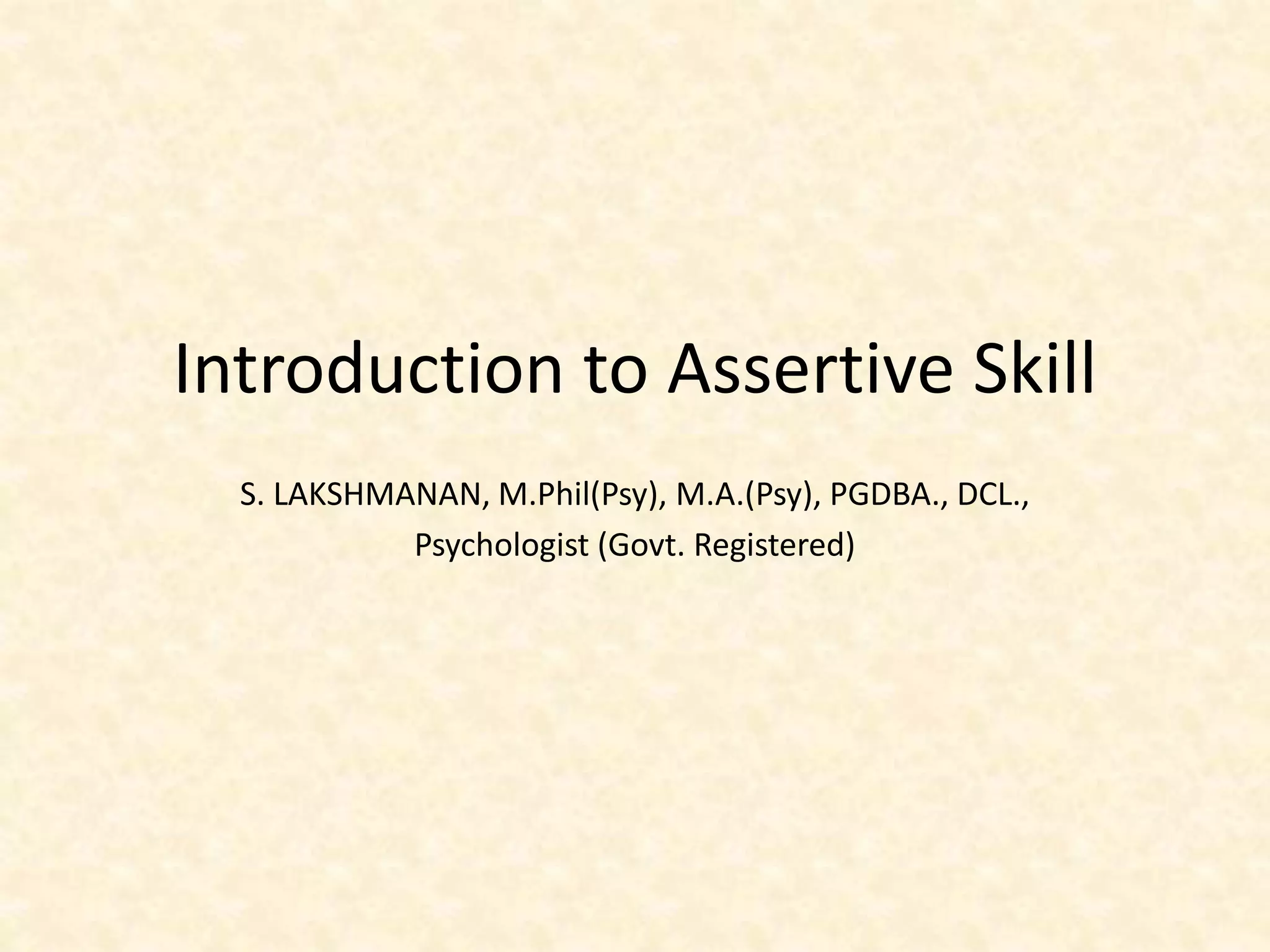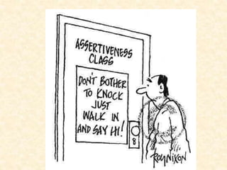 This document provides an introduction to assertiveness. It defines assertiveness as communicating one's needs, feelings, opinions and beliefs in an open and honest manner without violating others' rights. It discusses how assertiveness originated from civil rights and women's movements. The document contrasts assertiveness with aggression, which denies others' rights, and non-assertion, which denies one's own rights. It asserts that assertiveness simultaneously acknowledges both one's own rights and the rights of others.