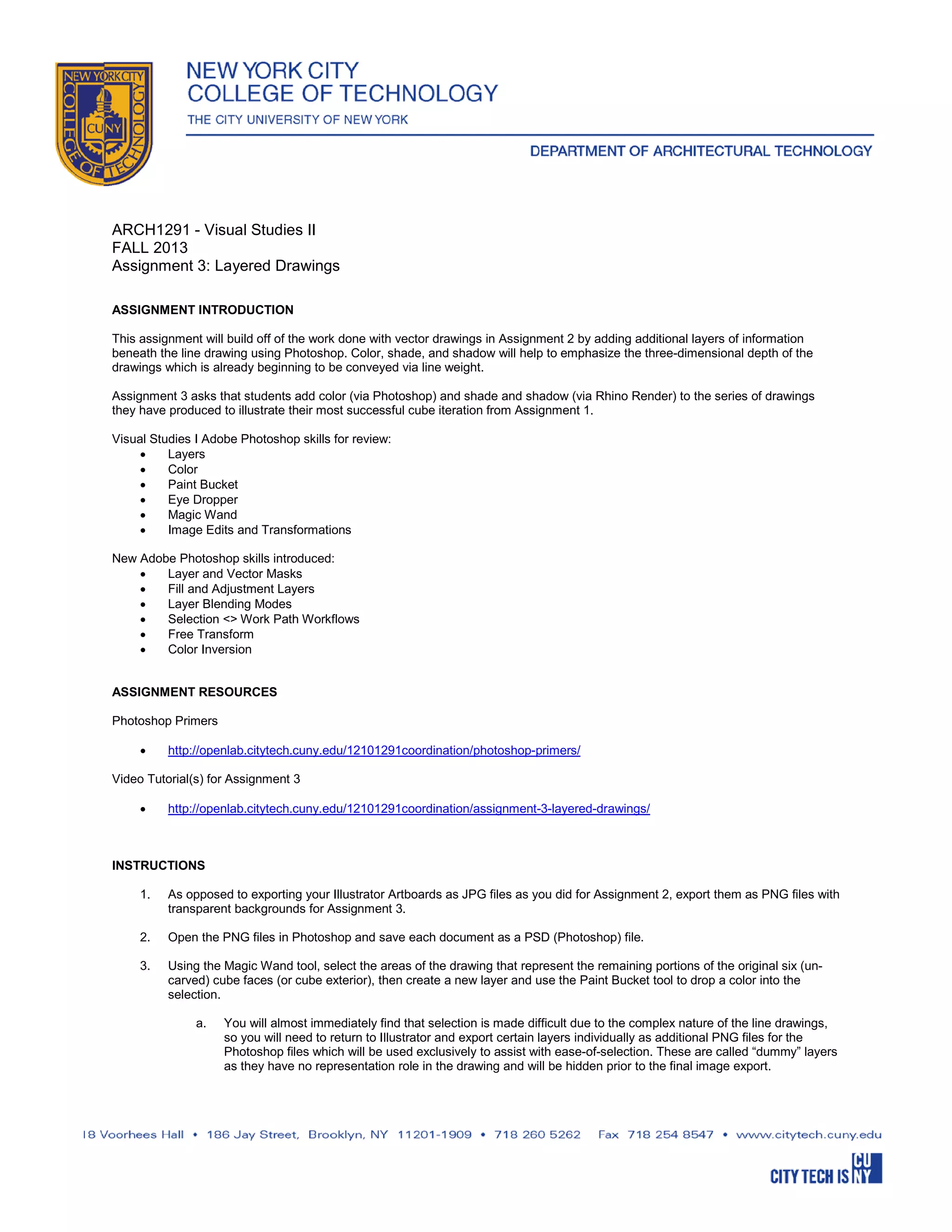 This assignment asks students to add color, shade, and shadow to their line drawings from Assignment 2 using Photoshop layers, masks, and blending modes. Students will color the exterior and interior cube surfaces on separate layers below the line work. They will also import renders from Rhino into Photoshop to represent shade and shadow and size them to fit using transforms. Layer blending will combine color and brightness values to enhance three-dimensional depth perception. The final files and printed drawings must follow specific guidelines and be submitted by the next class for grading.