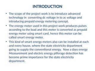 The document outlines a project focused on developing a prepaid energy meter using a PIC microcontroller, enabling the monitoring and controlling of energy consumption via a smart card system. This system aims to reduce power pilferage, streamline energy billing through automatic meter reading, and improve overall energy management for consumers and electricity providers. The project emphasizes the benefits of using prepaid meters, including customer flexibility, cost management, and energy conservation.