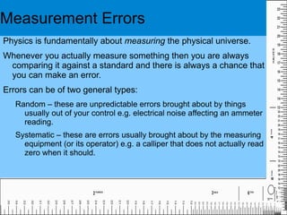 This document discusses uncertainties and errors in physical measurements. It explains that there are two types of errors - random errors which are unpredictable, and systematic errors caused by imperfect measuring equipment. Random errors can be reduced by repeating measurements, while systematic errors are reduced by calibrating equipment. Accuracy refers to how close a measurement is to the true value, while precision refers to how close repeated measurements are. The number of significant figures reported in a result should not exceed the least precise value used. The document also discusses determining and expressing uncertainties in measurements, and how to combine uncertainties when performing calculations or graphing data.