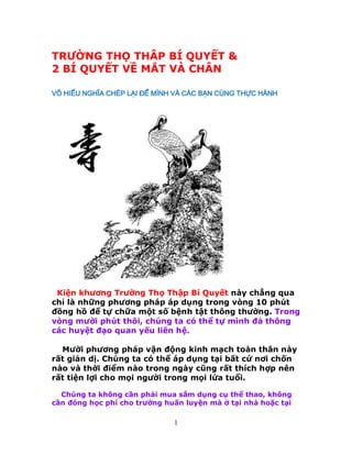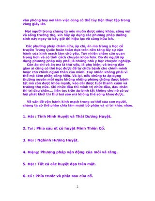 Tài liệu trình bày về các phương pháp dưỡng sinh dễ thực hiện trong vòng 10 phút, giúp tự chữa trị các bệnh thông thường và tăng cường sức khỏe. Nó nhấn mạnh tầm quan trọng của việc xoa bóp các huyệt đạo trên cơ thể, giúp lưu thông máu huyết và phòng ngừa bệnh tật. Những phương pháp này có thể áp dụng ở bất kỳ đâu, không cần dụng cụ và thích hợp cho mọi lứa tuổi.