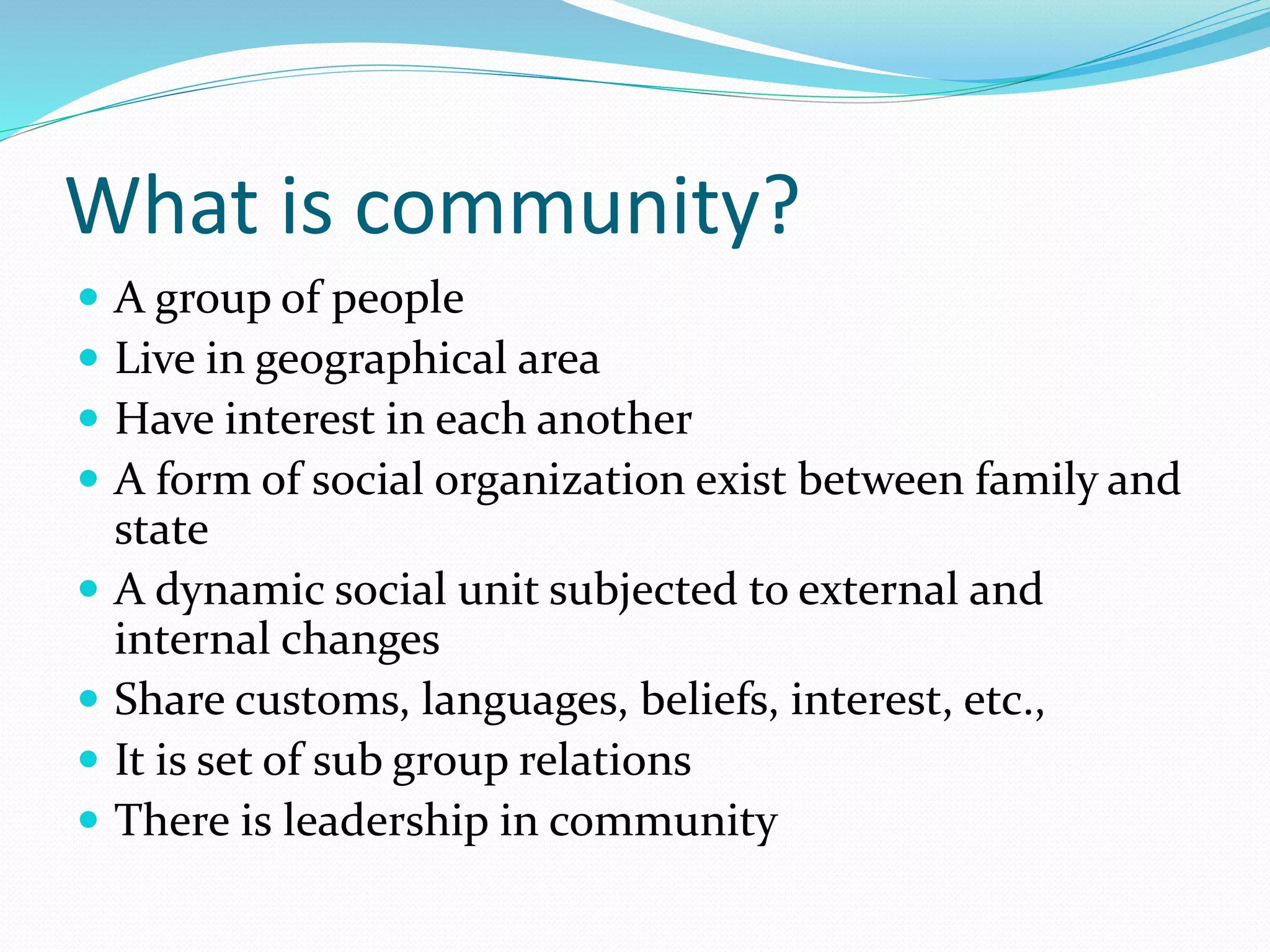 The document provides an overview of community development concepts and history in India. It defines community as a group of people living in a geographical area with shared interests. Community development is defined as a process where community members collectively work to solve common problems. The history of community development in India is summarized, from early initiatives under British rule to the Community Development Program launched in 1952 to promote rural development and improve livelihoods. Implementation of community development involves different administrative levels from national to district to village level.