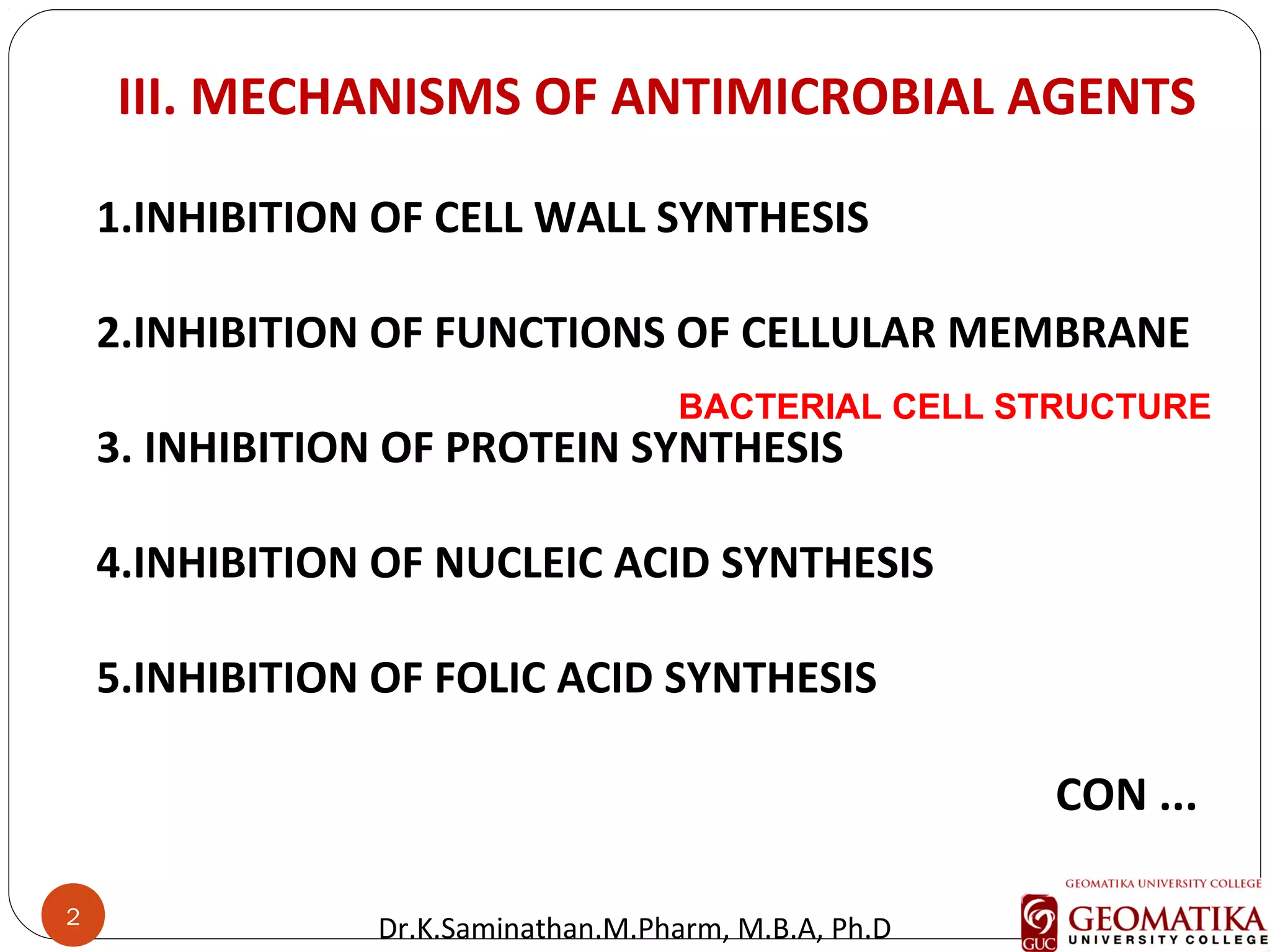 The document discusses the mechanisms and classifications of various antimicrobial agents, including antibiotics, antivirals, antifungals, and anthelmintics. It outlines the ways in which bacteria develop resistance to antibiotics and provides guidelines for both patients and healthcare professionals to prevent antibiotic resistance. Furthermore, it details the characteristics of ideal antimicrobial drugs and various treatment protocols for infections.