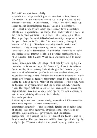 The document outlines a research proposal focused on cybersecurity in businesses, emphasizing the critical need for protecting intellectual property and financial information amidst rising cyber threats. It explores various cybersecurity risks, including insider threats and the impact of cyberattacks on organizational performance, as well as highlights the need for effective cybersecurity policies and practices. The research aims to analyze the current state of cybersecurity in companies and develop strategies to enhance their security measures.
